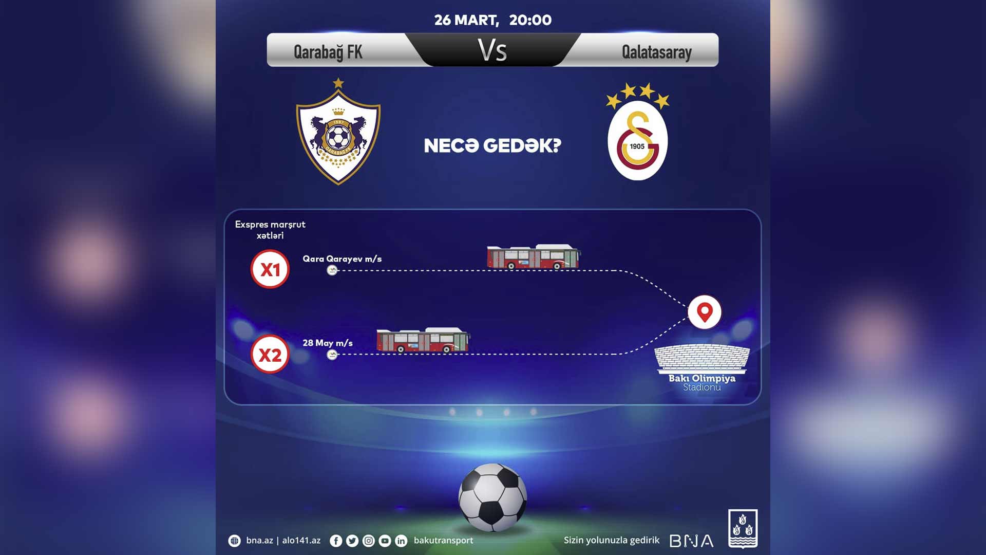 Matç günü 28 May və Qara Qarayev m/s-dan Bakı Olimpiya Stadionuna xüsusi avtobuslar işləyəcək. Onların cədvəli aşağıdakı kimi olacaq: