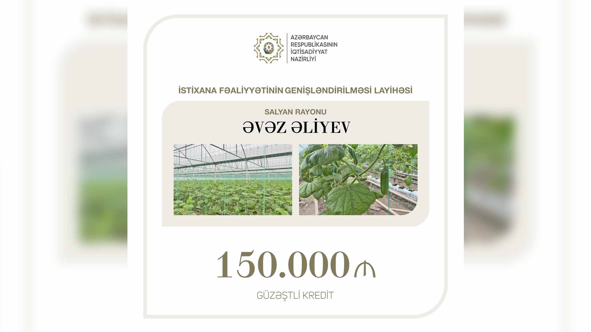Sahibkarlığın İnkişafı Fondundan (@sahibkarliq) #biznes təmsilçisi Əvəz Əliyevə istixana fəaliyyətinin genişləndirilməsi layihəsi üzrə 150 min ₼ #güzəştlikredit verilib. Layihə Salyan rayonunda icra olunacaq.#EconomyAz #SİF pic.twitter.com/W4rYdBwcQl