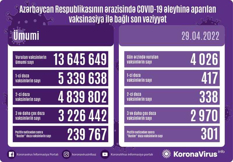 COVID-19 əleyhinə 4 026 peyvənd vurulub. Ölkədə vurulan vaksinlərin ümumi sayı 13 645 649 təşkil edib.