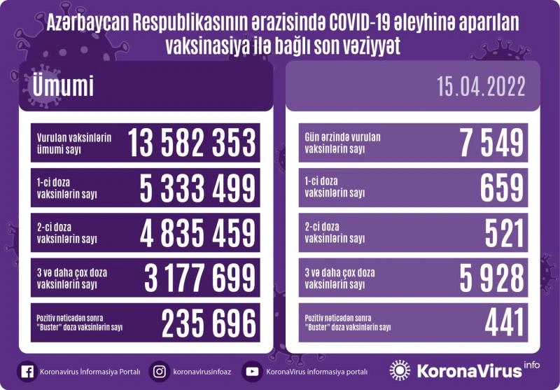 Son sutkada COVID-19 əleyhinə 7 549 peyvənd vurulub. Ölkədə vurulan vaksinlərin ümumi sayı 13 582 353 təşkil edib.