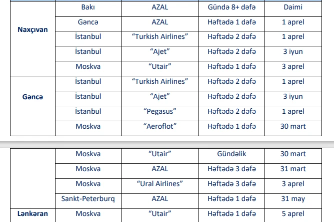 Yaz-yay uçuş cədvəli çərçivəsində Azərbaycanın regional hava limanlarından uçuşların sayı artırılır və yeni istiqamətlər əlavə olunur.