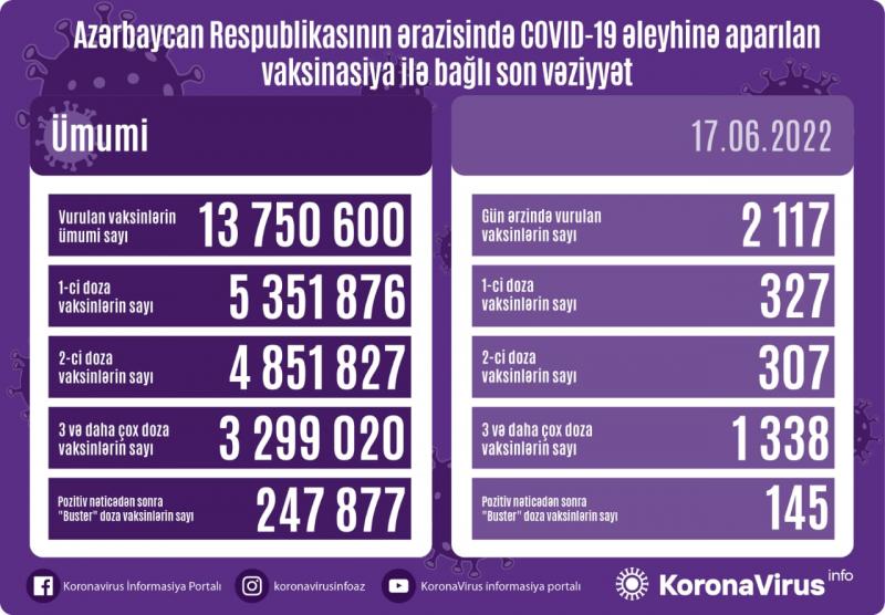Koronavirus əleyhinə 2 117 peyvənd vurulub. Ölkədə vurulan vaksinlərin ümumi sayı 13 750 600 təşkil edib.