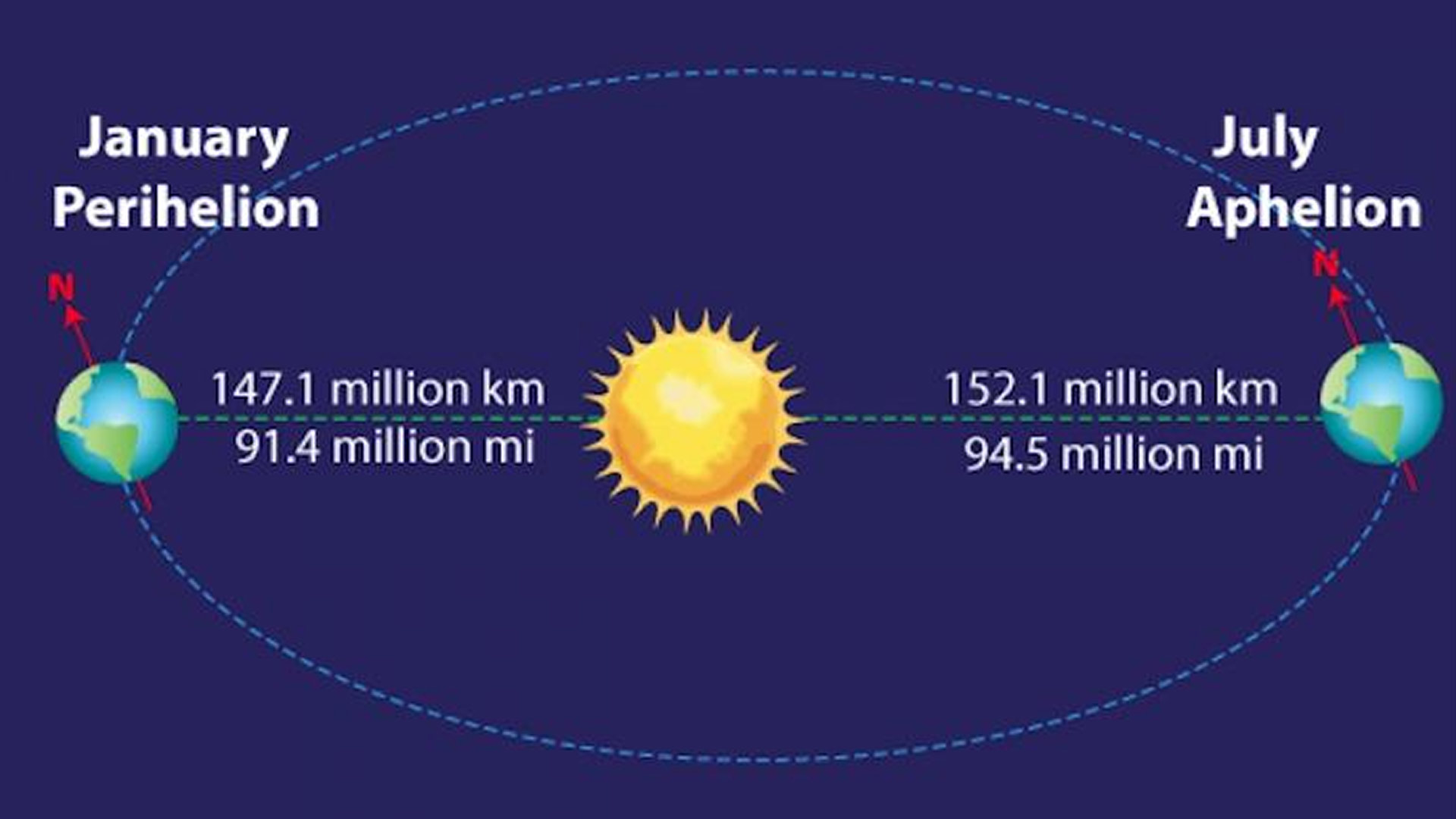 Afelidə Yer Günəşdən perihelidə olduğundan təxminən 7% az günəş enerjisi alır. Amma bu, fəsillərin dəyişməsinə təsir etmir. Fəsillərin dəyişməsi Günəşə qədər məsafənin dəyişməsi ilə deyil, Yerin Günəş ətrafında dolanması və eyni zamanda onun fırlanma oxunun orbit müstəvisinə meyilli olması ilə bağlıdır. Günəşə qədər məsafənin dəyişməsi şimal və cənub yarımkürələrində qış və yay arasındakı temperatur fərqinə təsir göstərir.