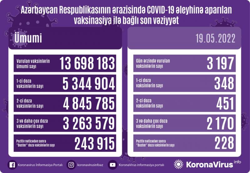 Koronavirus əleyhinə 3 197 peyvənd vurulub. Ölkədə vurulan vaksinlərin ümumi sayı 13 698 183 təşkil edib.