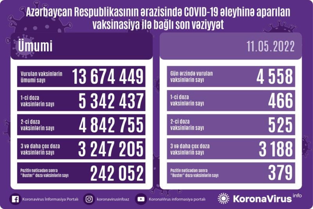 COVID-19 əleyhinə 4 558 peyvənd vurulub. Ölkədə bu günədək vurulan vaksinlərin ümumi sayı 13 674 449 təşkil edib.