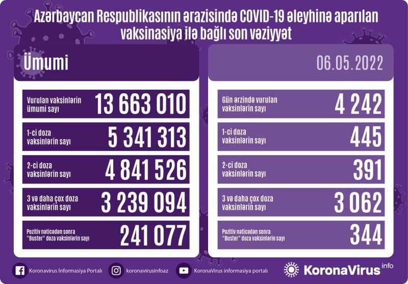 Koronavirus əleyhinə 4 242 peyvənd vurulub. Ölkədə vurulan vaksinlərin ümumi sayı 13 663 010 təşkil edib.