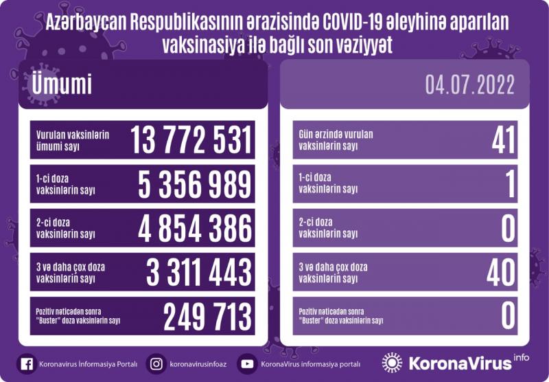 COVID-19 əleyhinə 41 peyvənd vurulub. Ölkədə vurulan vaksinlərin ümumi sayı 13 772 531 təşkil edib.