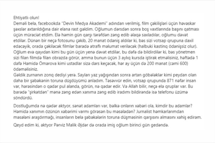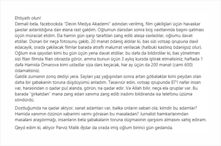 Belə ki, “Devin Medya Akademi” film çəkilişləri üçün həvəskar şəxslər axtarıldığına dair elan paylaşıb. Bu elanı görüb müraciət edən şəxslərdən “WhatsApp” qrupuna əlavə olunmaları üçün 20 manat tələb olunub. Sonrakı prosesdə isə 3 aylıq kurs üçün 600 manat ödənilməsi tələbi irəli sürülüb.