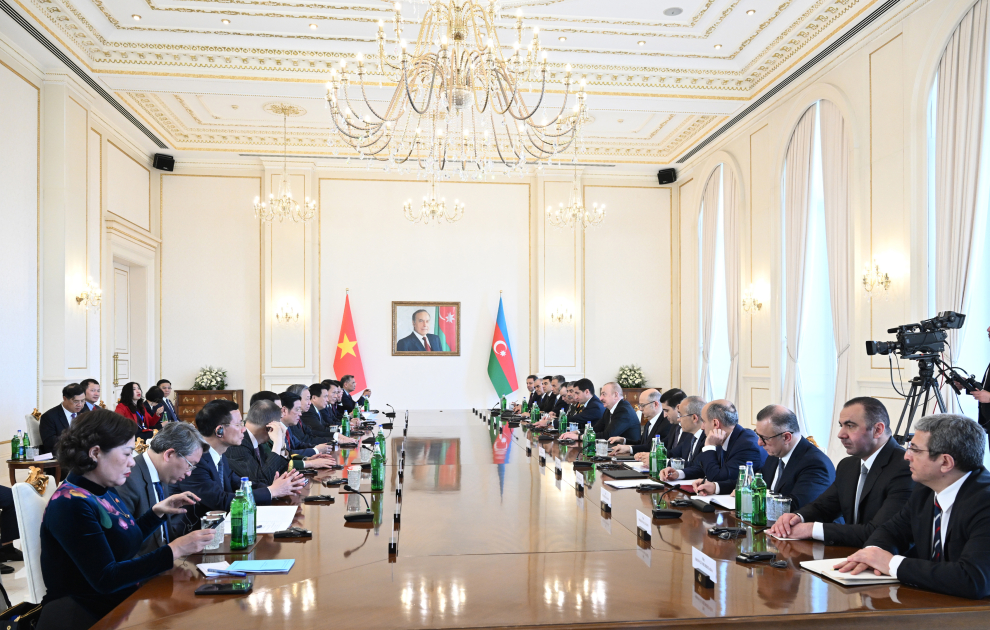 Azərbaycan Respublikasının Prezidenti İlham Əliyevin Vyetnam Sosialist Respublikası Kommunist Partiyasının Mərkəzi Komitəsinin Baş katibi To Lam ilə geniş tərkibdə görüşü başlayıb.