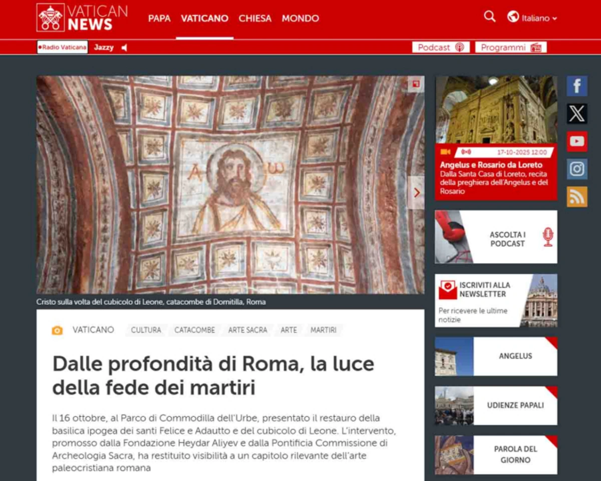 Müqəddəs Taxt-Tacın informasiya resursları Azərbaycanın Birinci vitse-prezidenti Mehriban Əliyevanın iştirakı ilə oktyabrın 16-da Müqəddəs Komodilya katakombalarının bərpası layihəsinin açılışını diqqətdə saxlayıb.